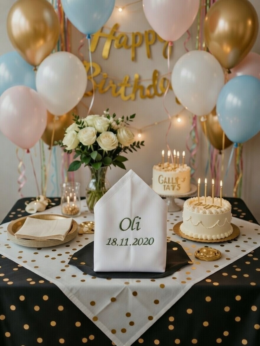 Lieferumfang: Stoffservietten mit Name und Datum.