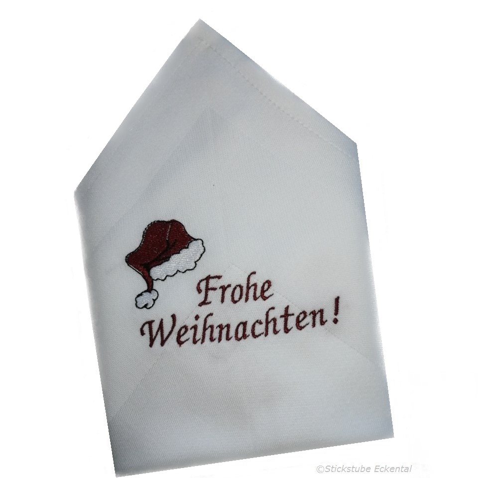 Lieferumfang: Stoffservietten mit Mütze und Frohe Weihnachten bestickt.