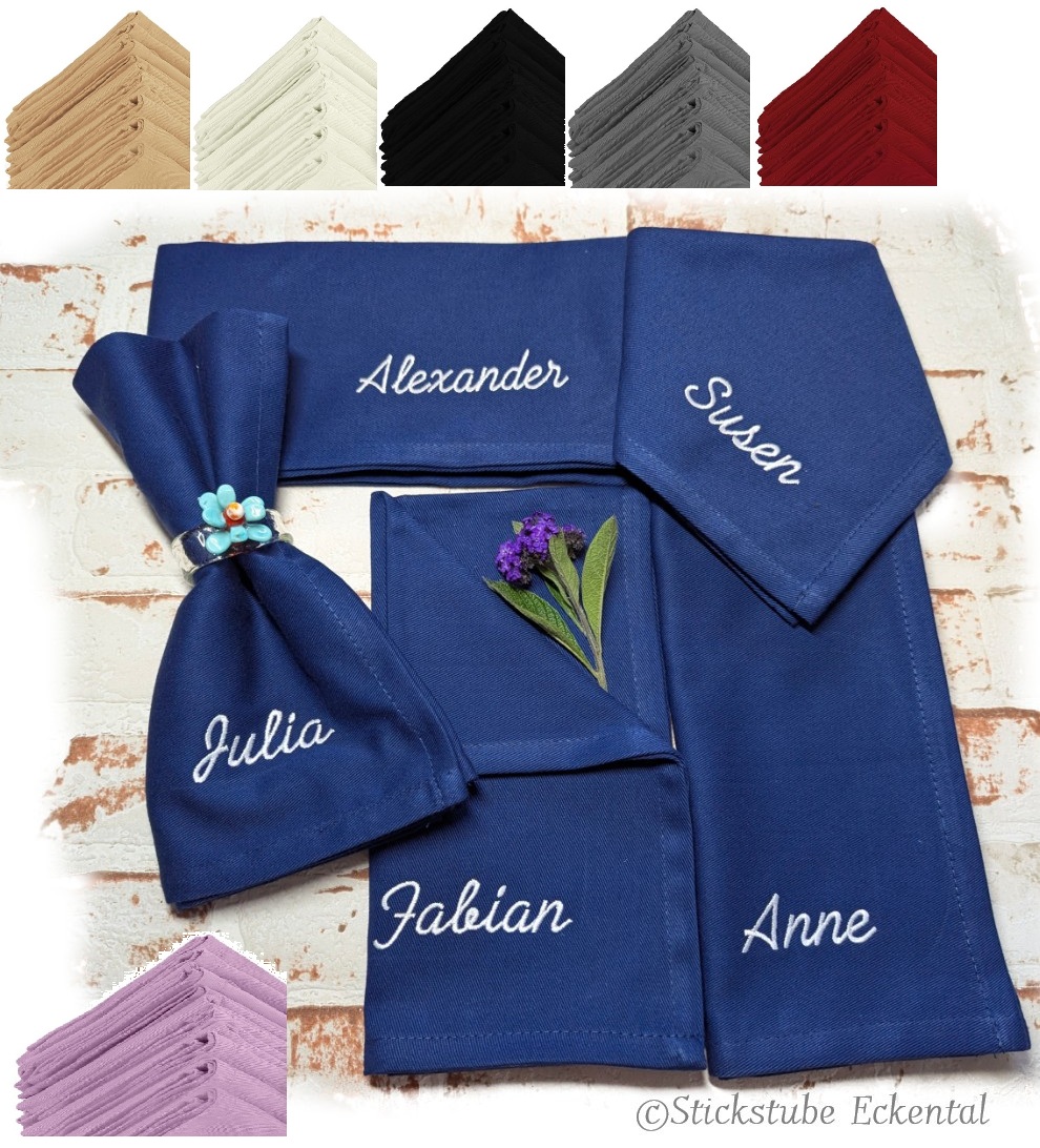 Lieferumfang: Stoffservietten mit Name bestickt.