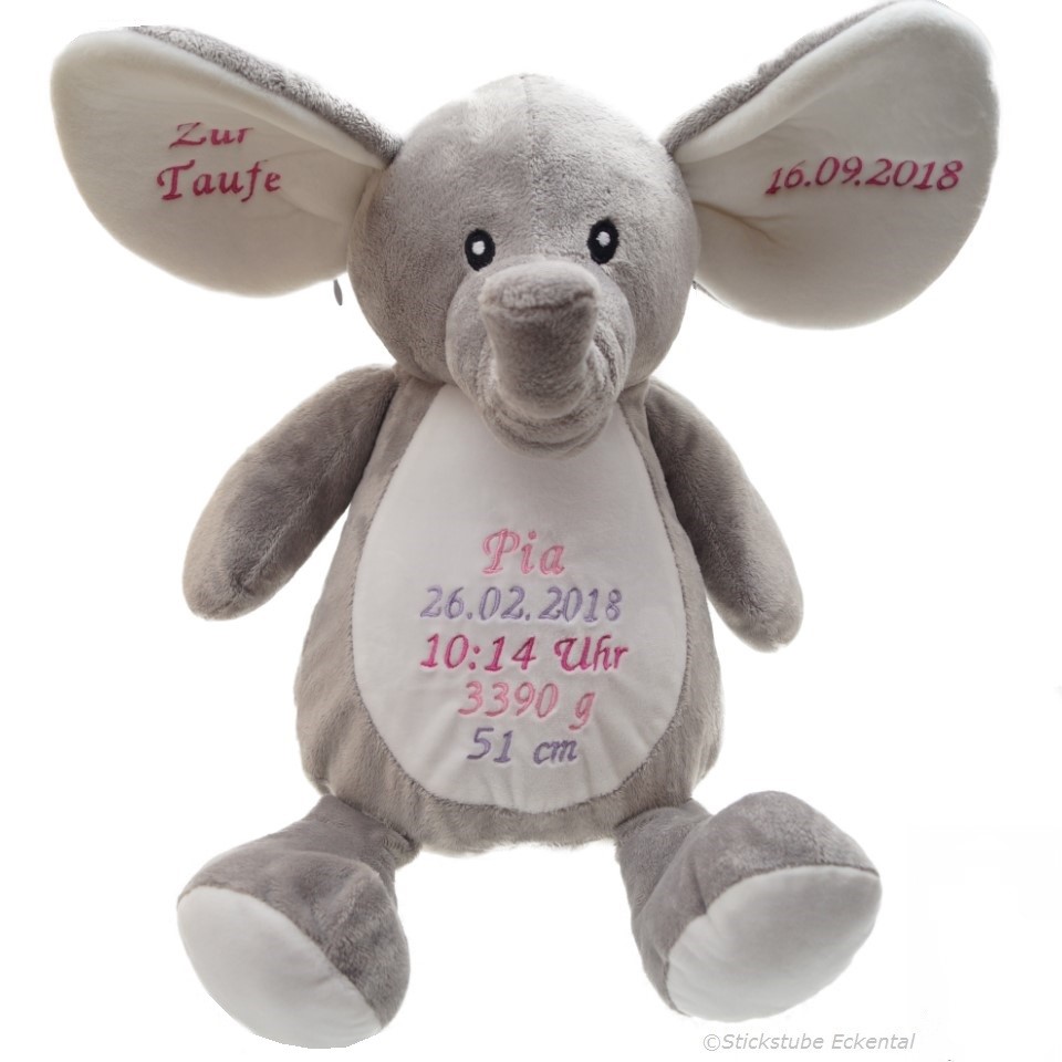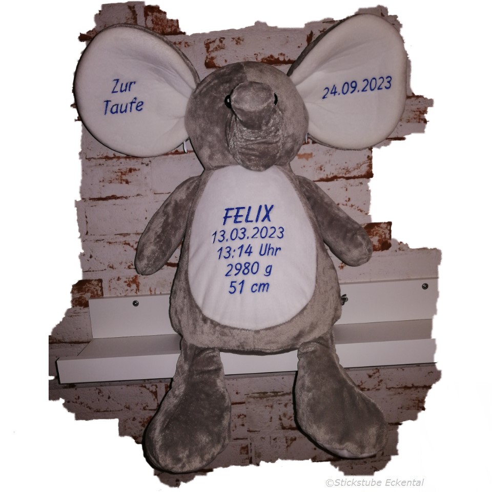 Bitte beachten Sie, das der Elefant nur begrenzten Platz für eine Stickerei bietet, der Name sollte nicht allzu lang sein. Optimal passend für ca. bis zu 11 Buchstaben, Doppelnamen können untereinander gestickt werden.