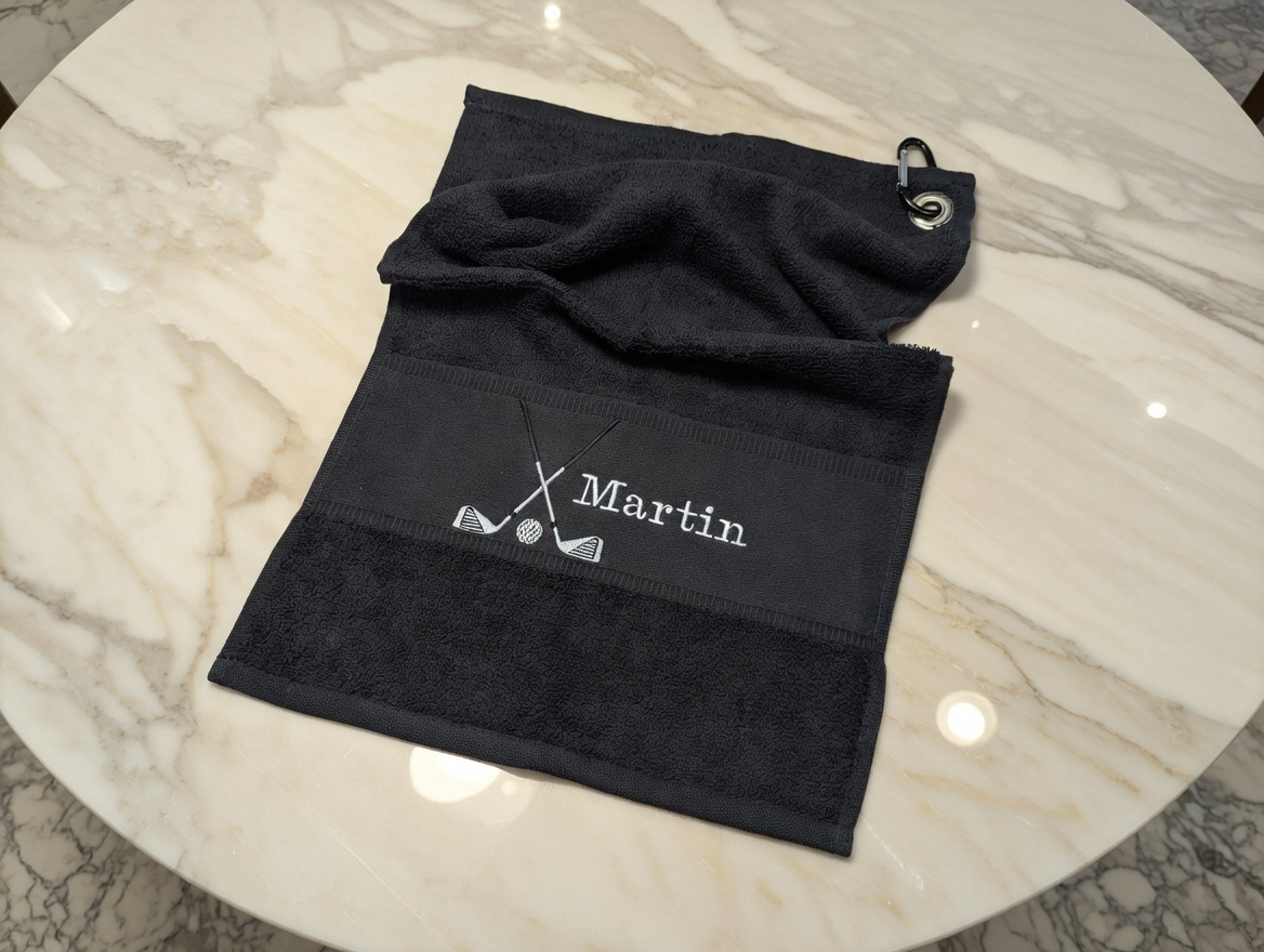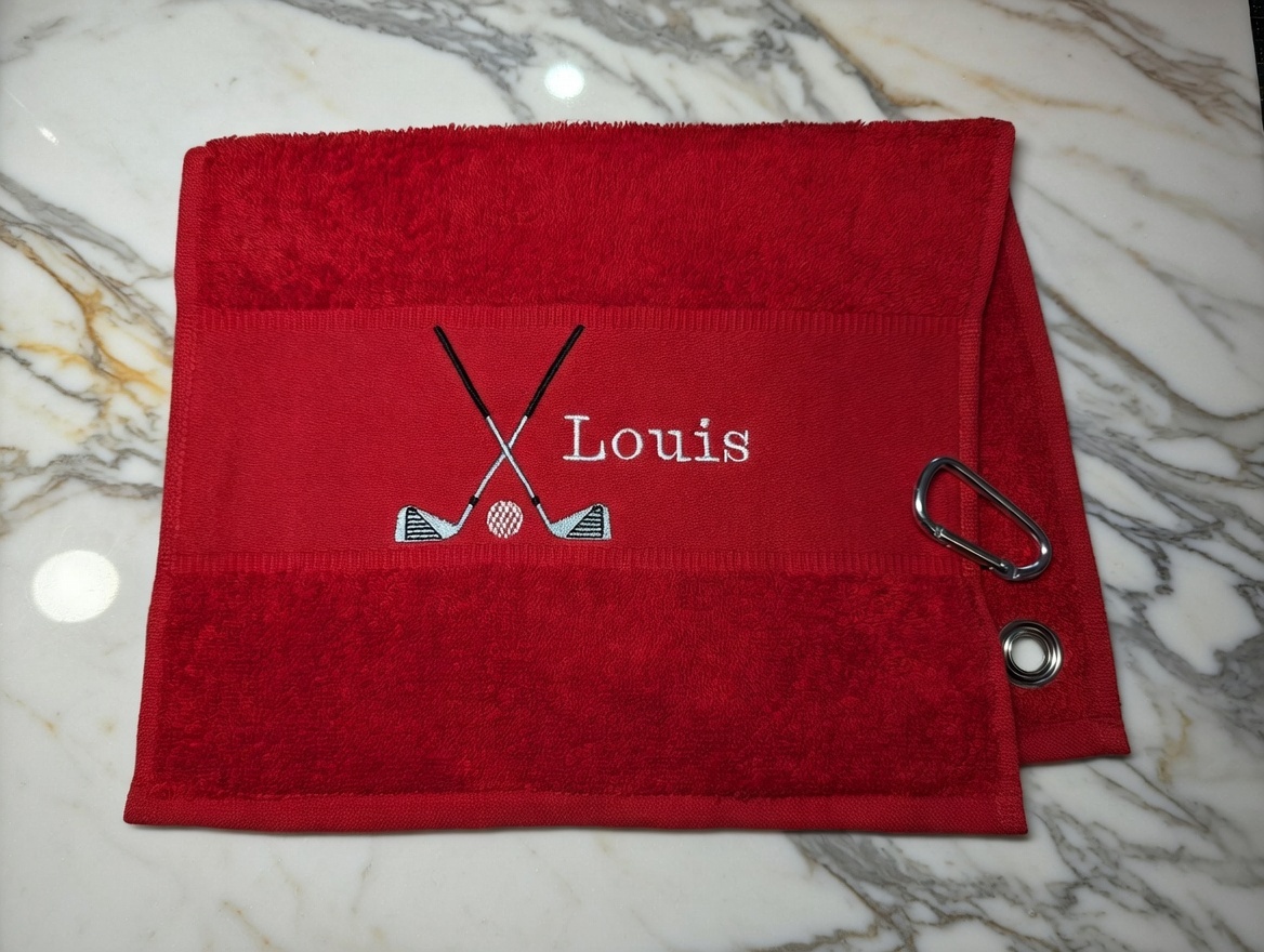 Suchen Sie ein hochwertiges, personalisiertes Golfhandtuch, das nicht nur praktisch ist, sondern auch stilvoll aussieht? Dieses bestickte Golftuch hält Ihre Schläger und Bälle zuverlässig sauber und ist dank des robusten Karabiners immer griffbereit an Ihrem Golfbag.