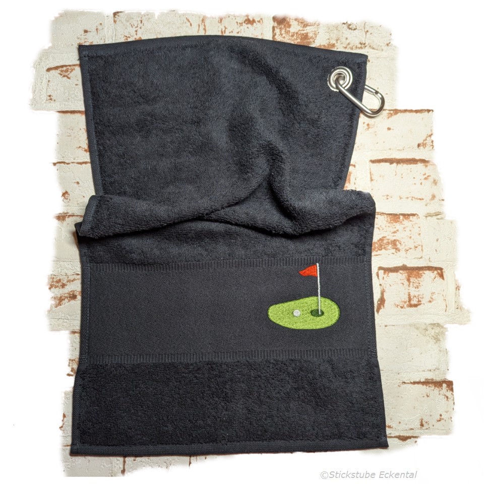 Befestigen Sie dieses Golfhandtuch an Ihrem Golfbag, damit Sie sich den Schweiß aus den Augen wischen und gut sehen können, bevor Sie ein Hole-in-One spielen.