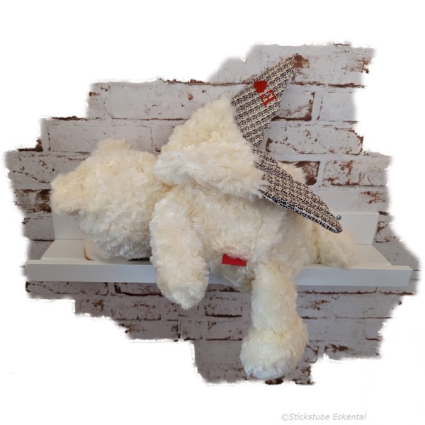 Das Stofftier wird auf dem Flügel rückseitig bestickt.
