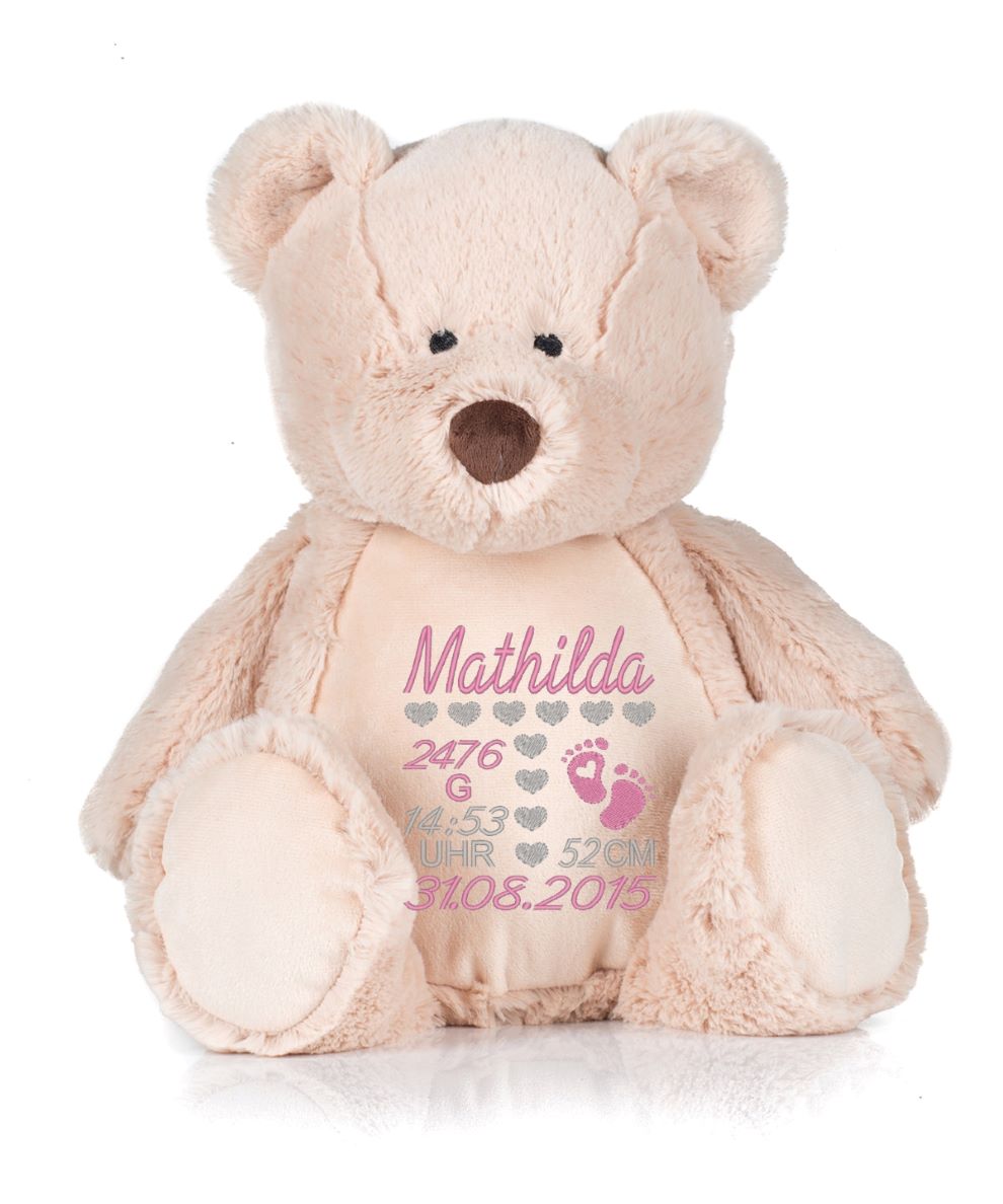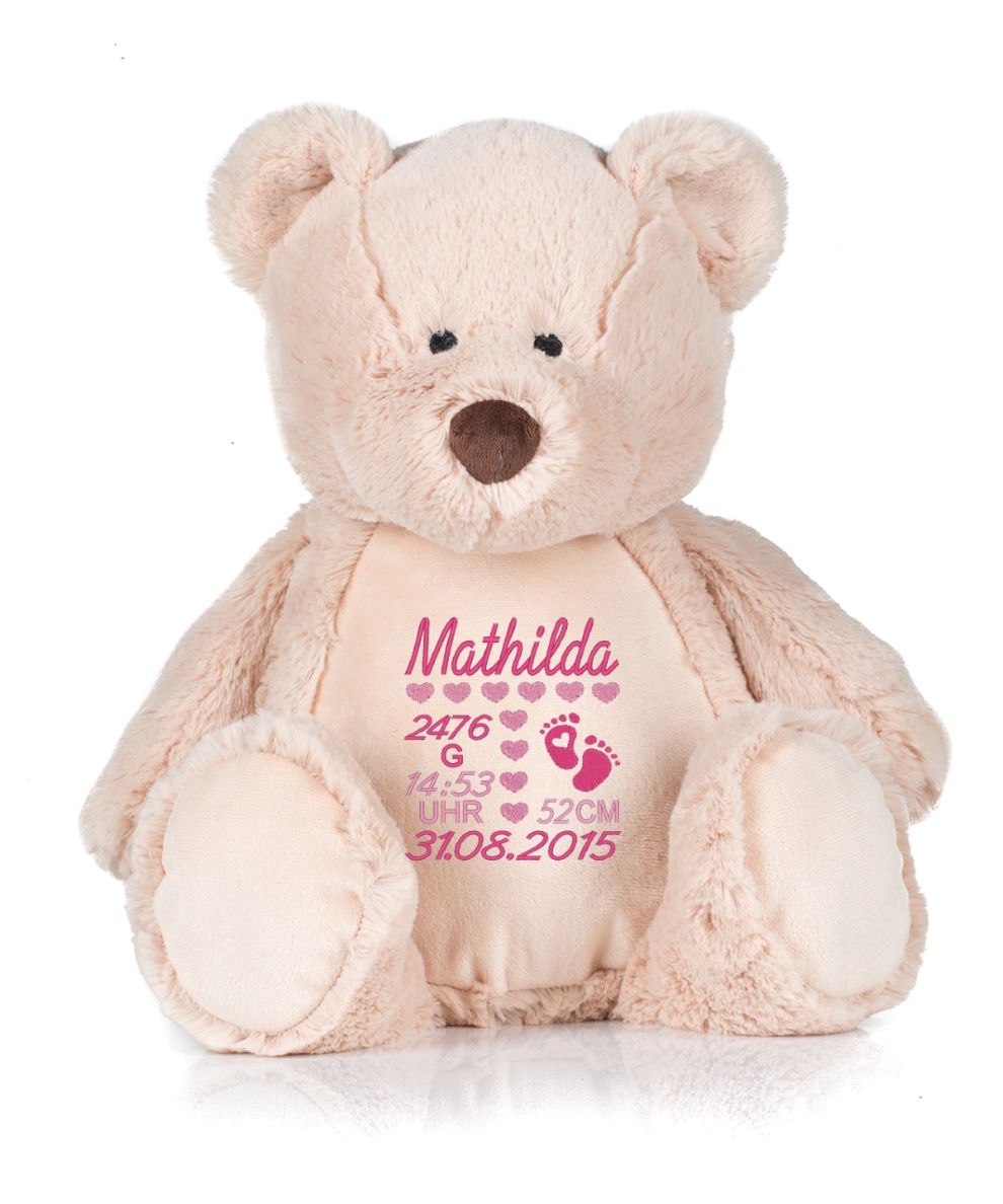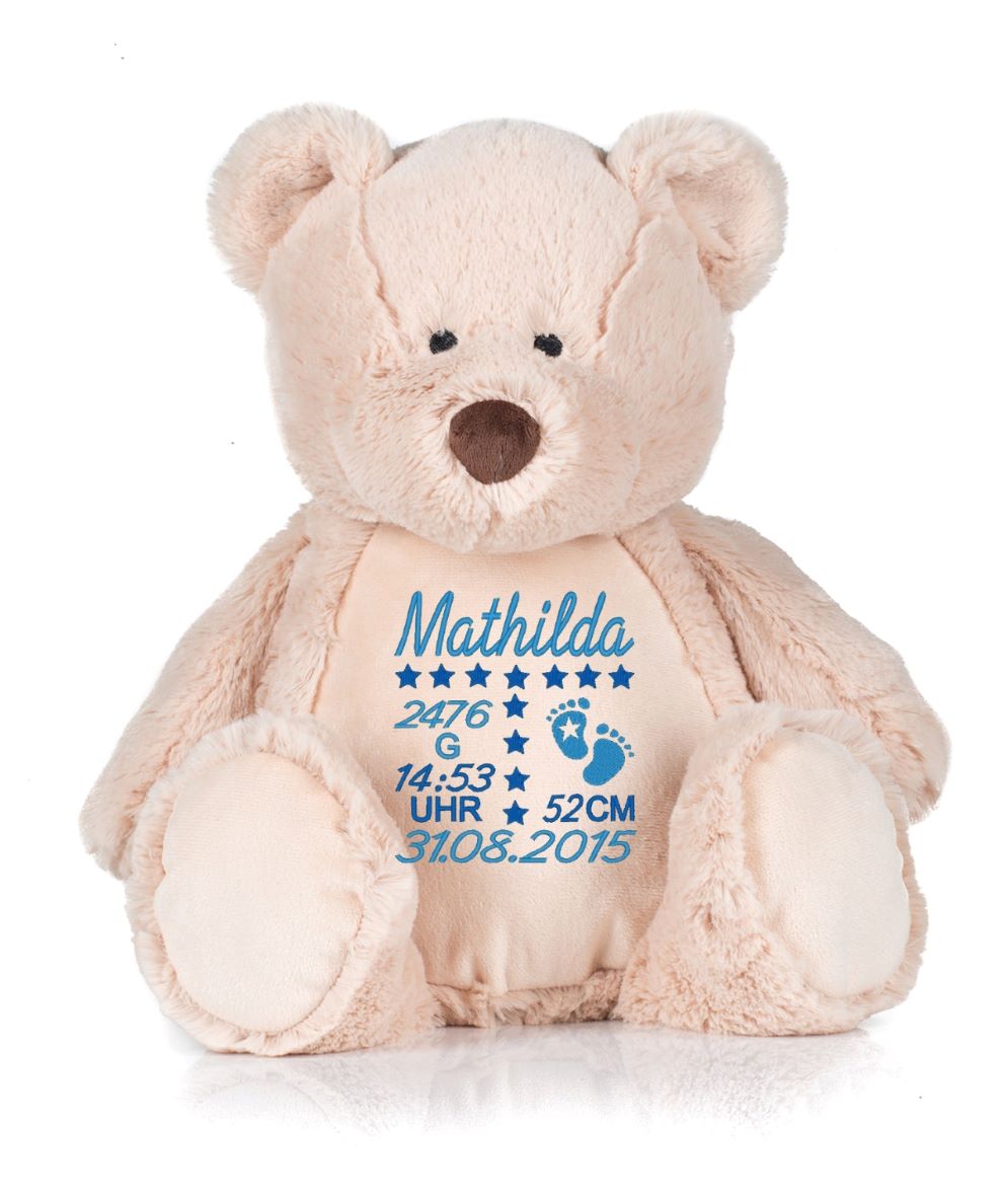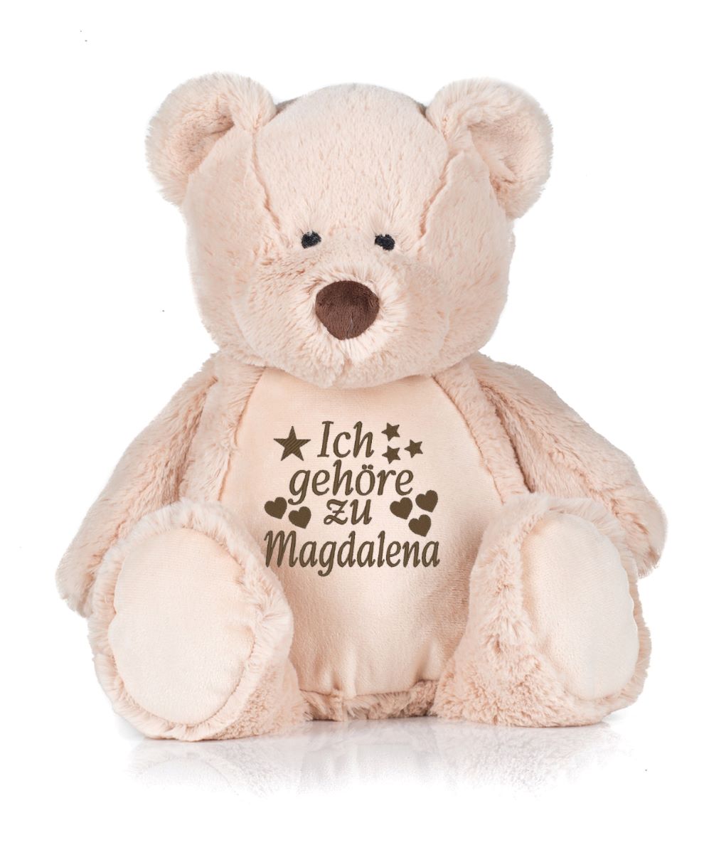 Die bestickte Variante besticht durch ein edles Design und ist deutlich strapazierfähiger als eine Bedruckung; das bedeutet, Sie können das Stofftier viele Male waschen, ohne dass sich die Schrift auflöst.
