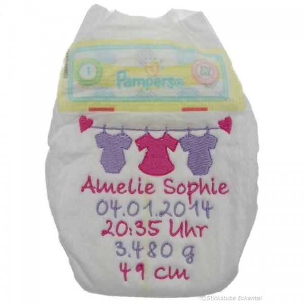 Bitte beachten Sie, das die Windel nur begrenzten Platz für eine Stickerei bietet, der Name sollte nicht allzu lang sein. Optimal passend für ca. bis zu 13 Buchstaben, Doppelnamen können nicht untereinander gestickt werden.