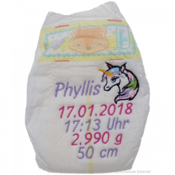 Windel bestickt mit Wunschdaten Einhorn