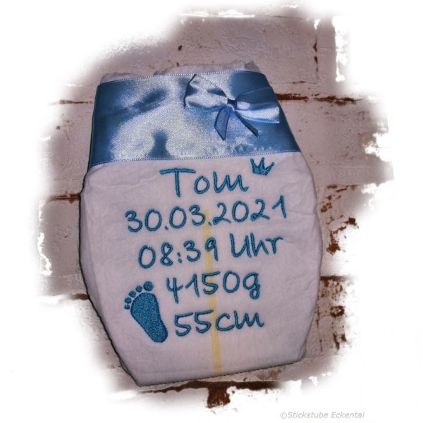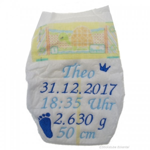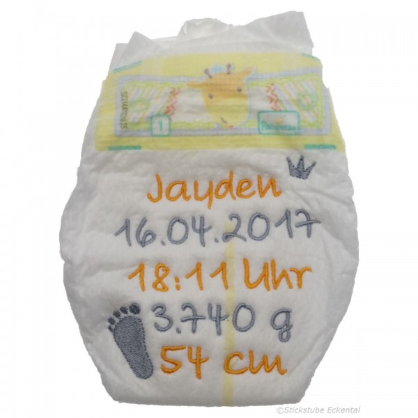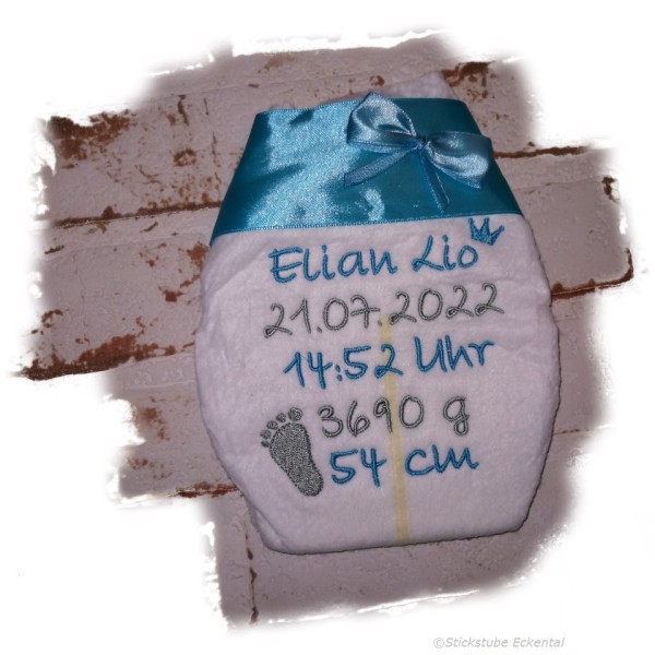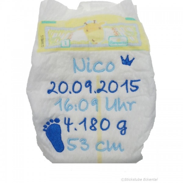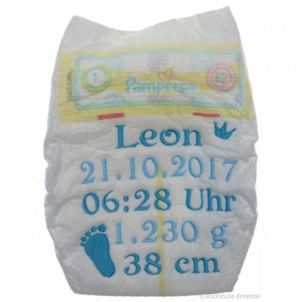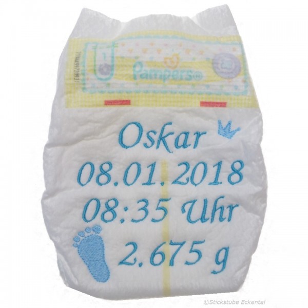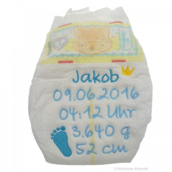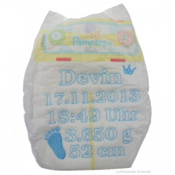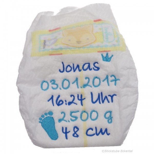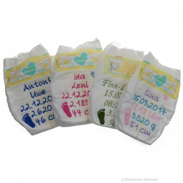Bitte beachten Sie, das die Windel nur begrenzten Platz für eine Stickerei bietet, der Name sollte nicht allzu lang sein. Optimal passend für ca. bis zu 8 Buchstaben, Doppelnamen können untereinander gestickt werden.