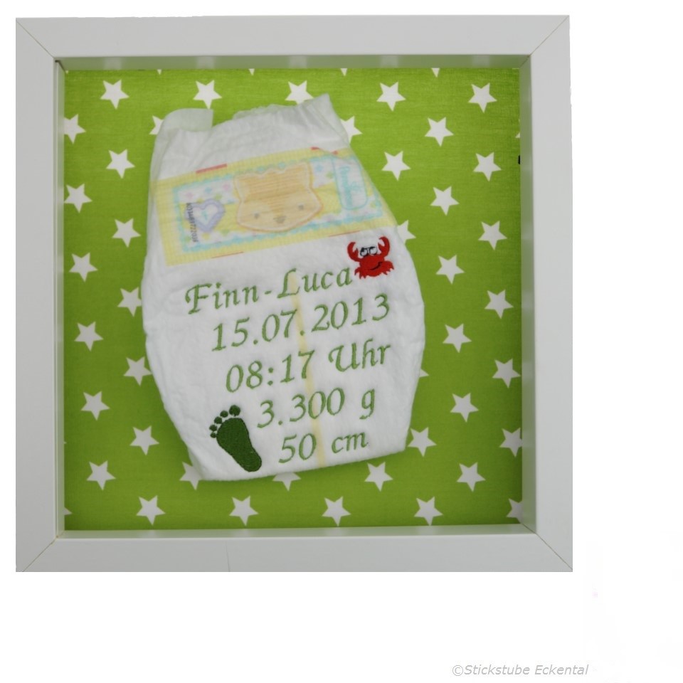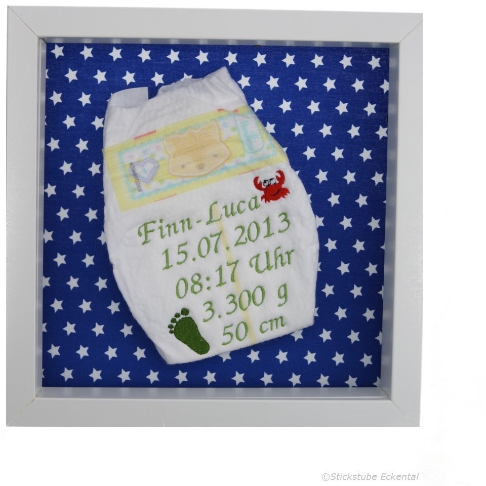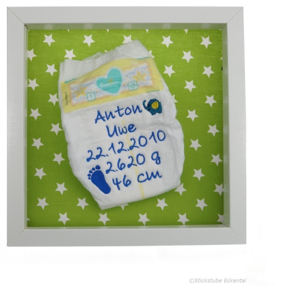 Bitte beachten Sie, das die Windel nur begrenzten Platz für eine Stickerei bietet, der Name sollte nicht allzu lang sein. Optimal passend für ca. bis zu 8 Buchstaben, Doppelnamen können untereinander gestickt werden.