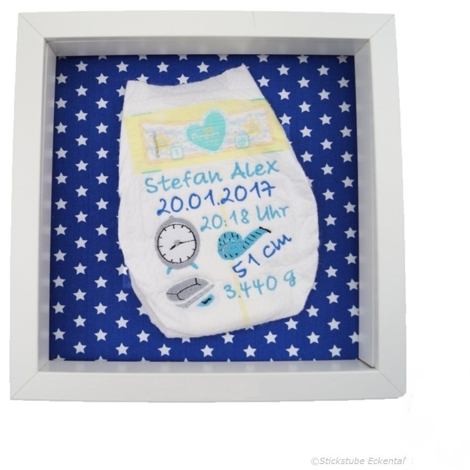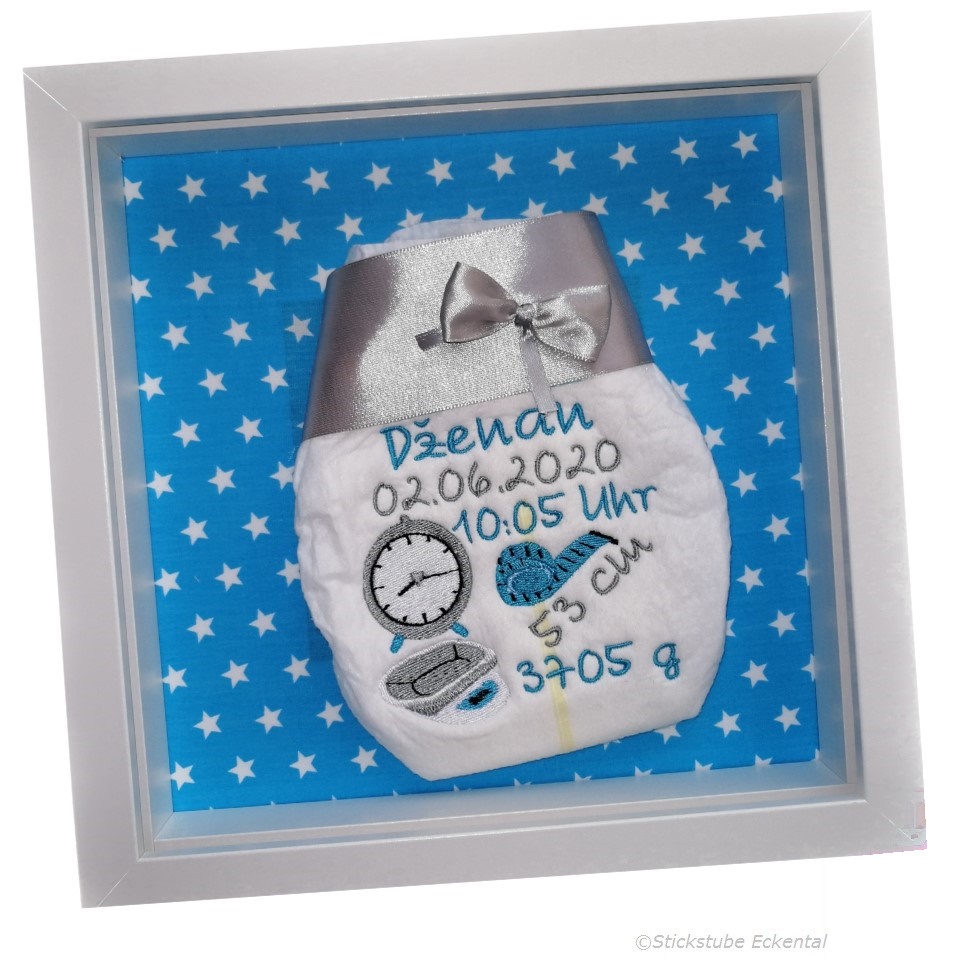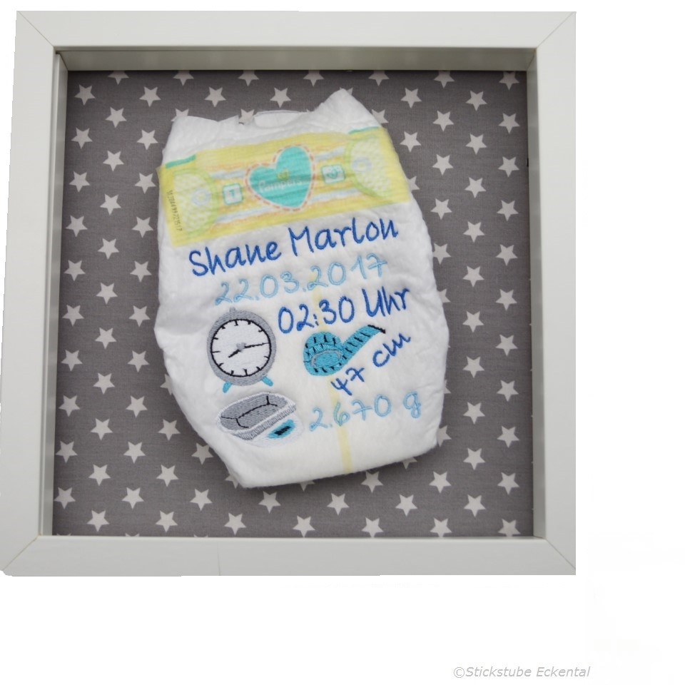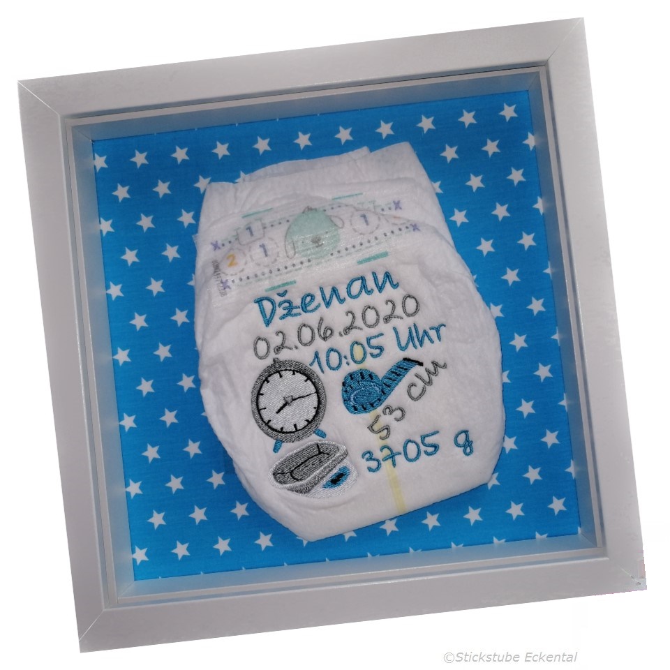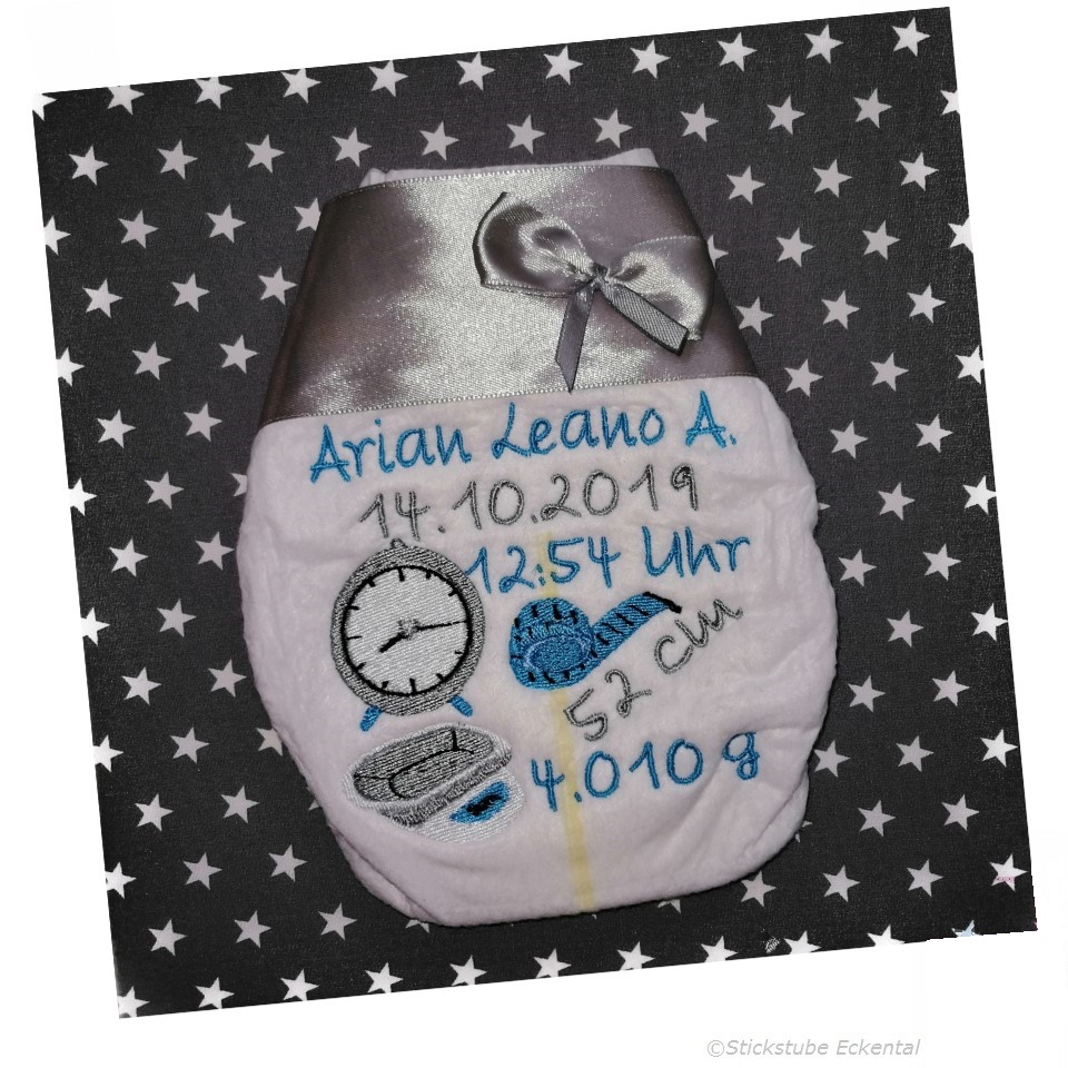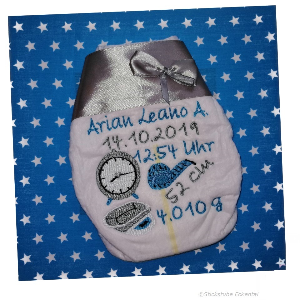 Bitte beachten Sie, das die Windel nur begrenzten Platz für eine Stickerei bietet, der Name sollte nicht allzu lang sein. Optimal passend für ca. bis zu 14 Buchstaben, Doppelnamen können nicht untereinander gestickt werden.