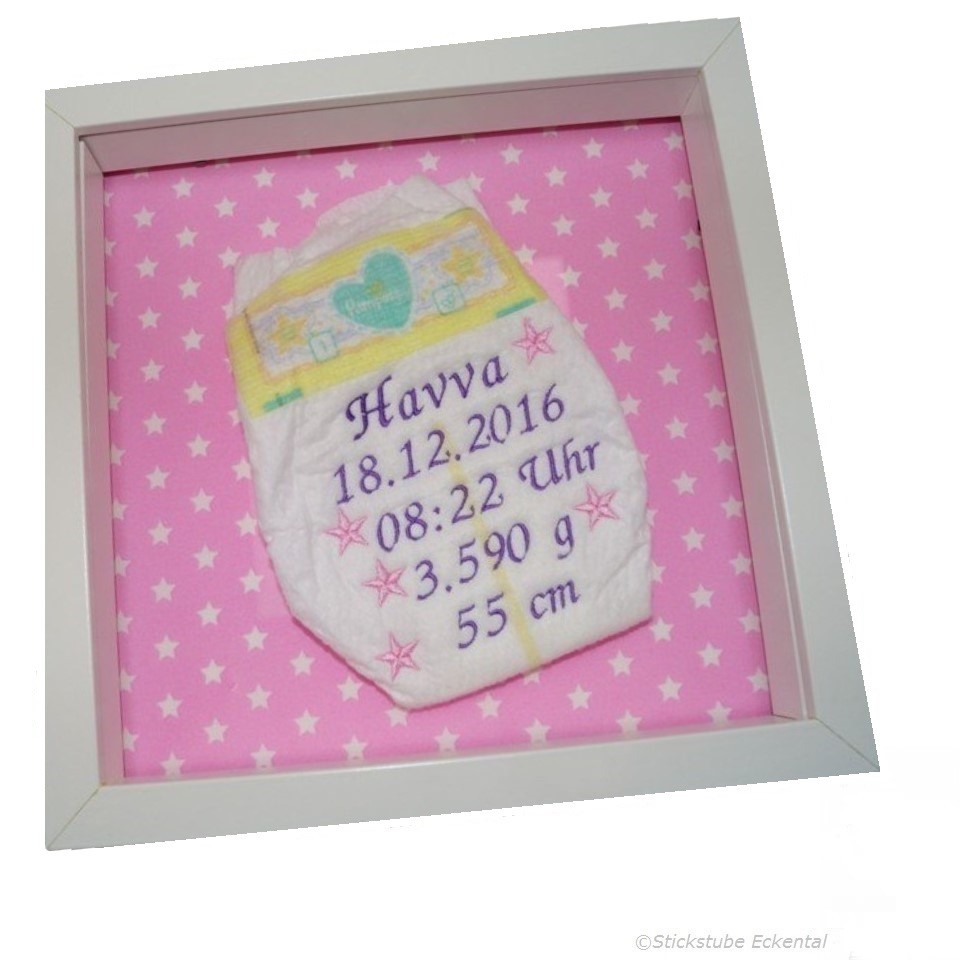 Windel im Rahmen mit Wunschdaten bestickt Sternen