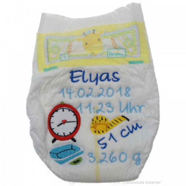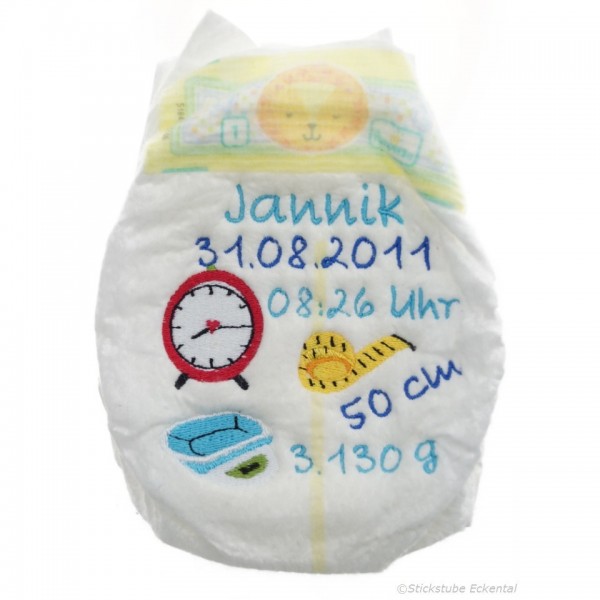 Windel bestickt mit Wunschdaten rot/gelb/türkisblau