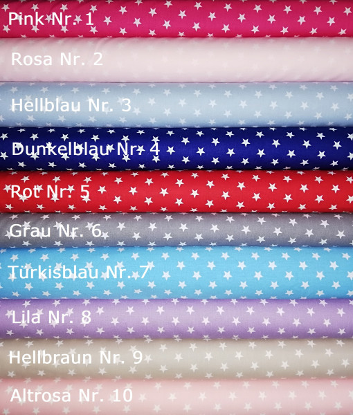 Schwarz, beige, braun, grau, dunkelrot, hellrot, dunkelgrün, hellgrün, dunkelblau, türkisblau, hellblau, flieder, orange, gelb, pink und rosa.